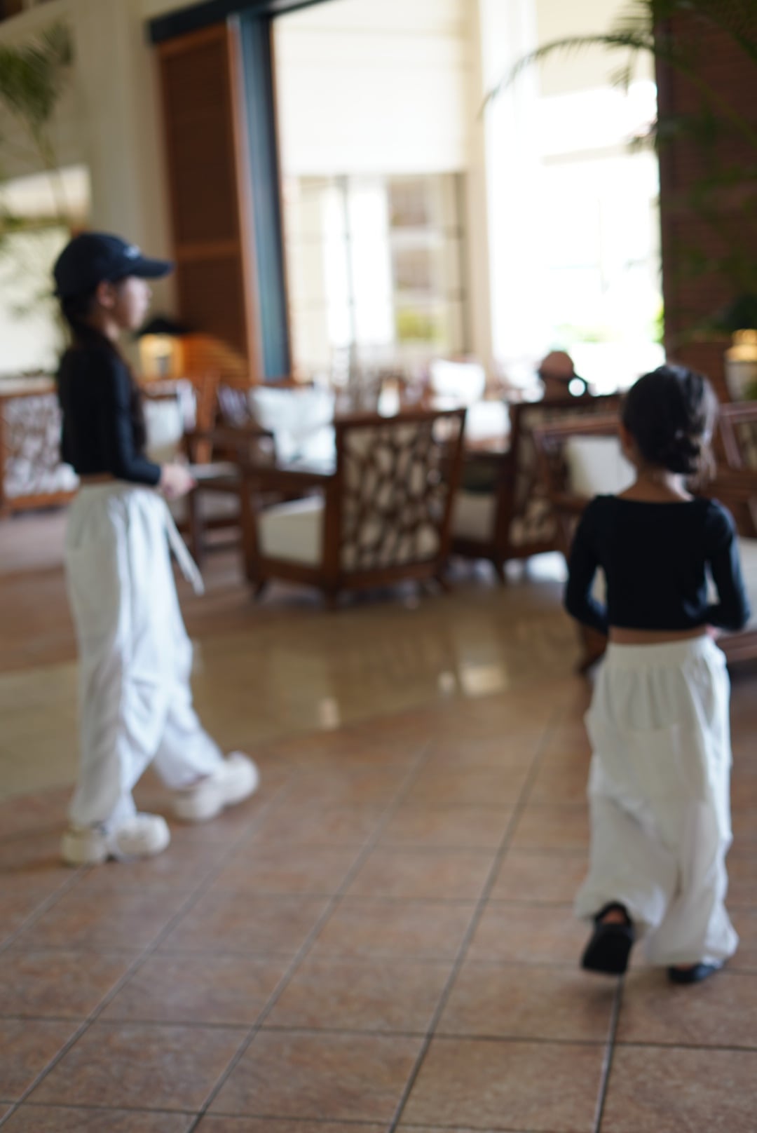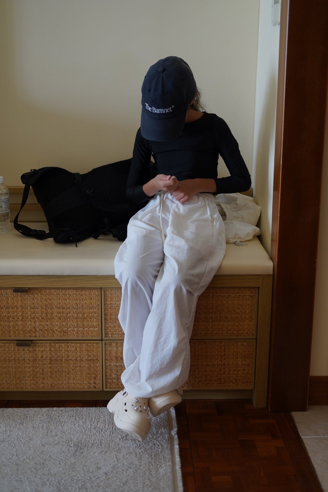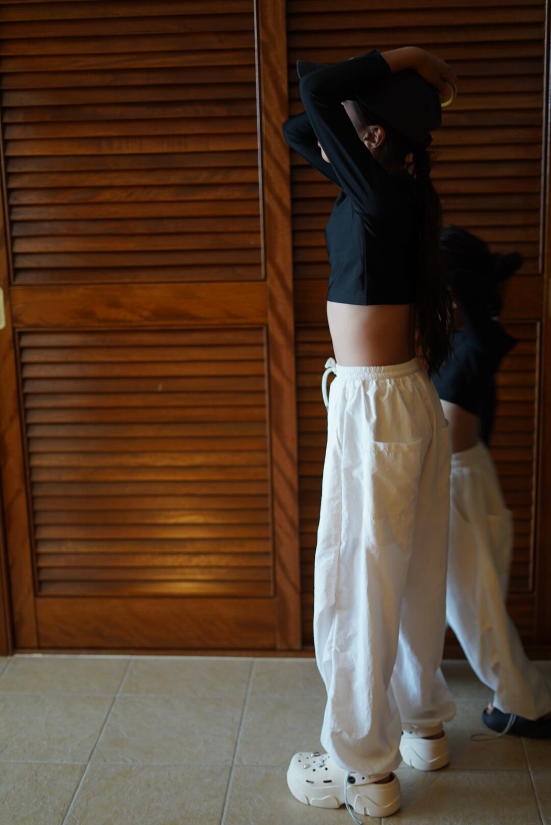 シルエットやナイロン素材も可愛いく、どんなトップスもあわせやすい万能パンツ