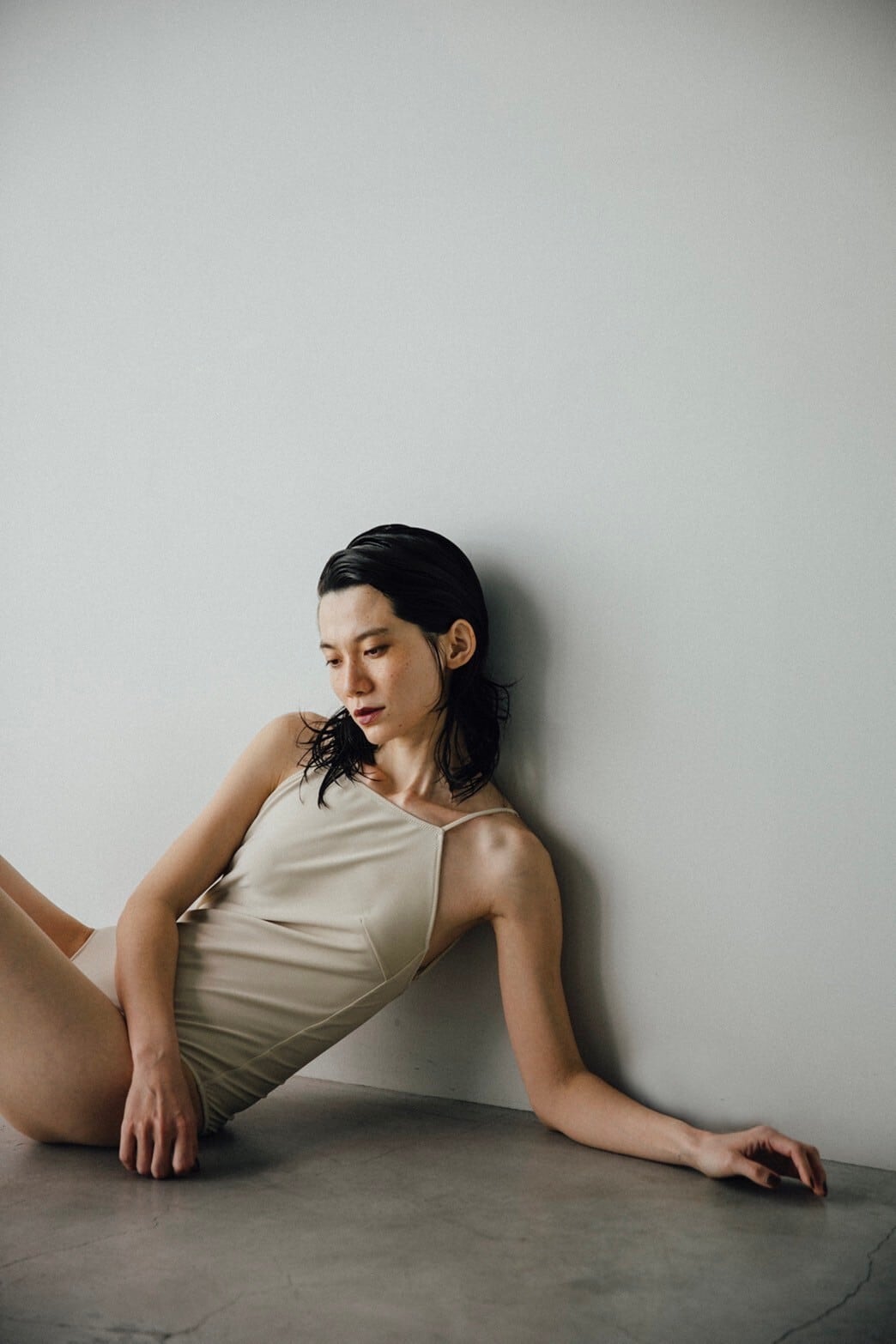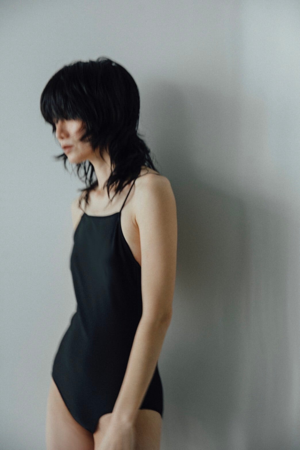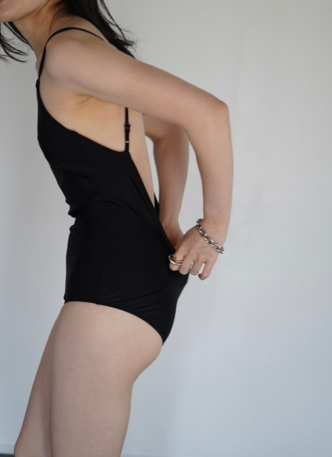 肩紐はできるかぎり華奢に、余計なものは削ぎ落としたキャミスーツデザインです